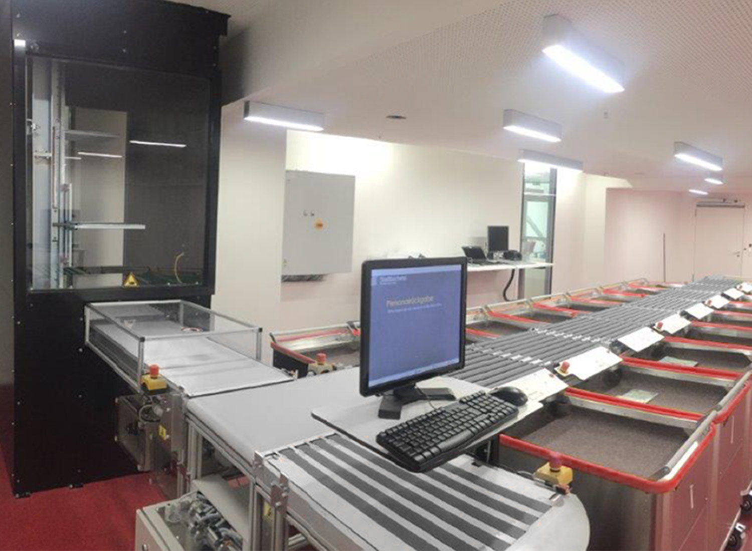 In August 2017, the Central Library installed a new complex solution for materials return, transportation and sorting. It consists of two return points with 2-way sorting on the ground floor and a sorting system in the basement with 16 bins. An elevator lift seamlessly connects the two floors. One of the two return points is located in the foyer, which, thanks to electronic access control, can be accessed from 6 am to midnight, regardless of the opening hours. The other return is inside the library.
