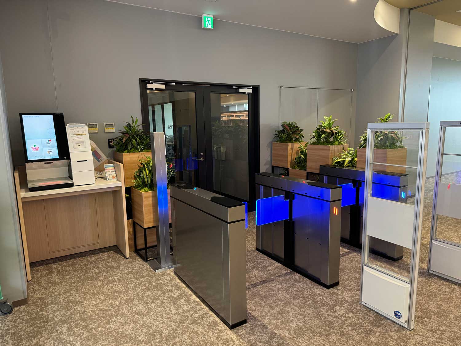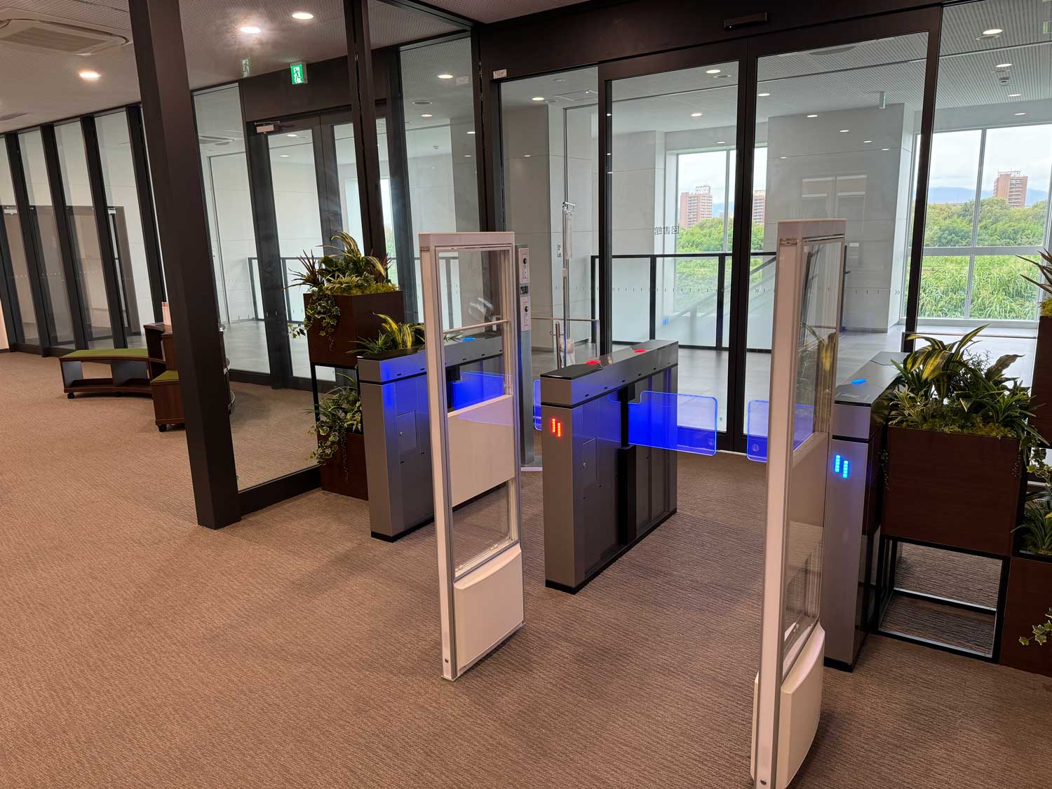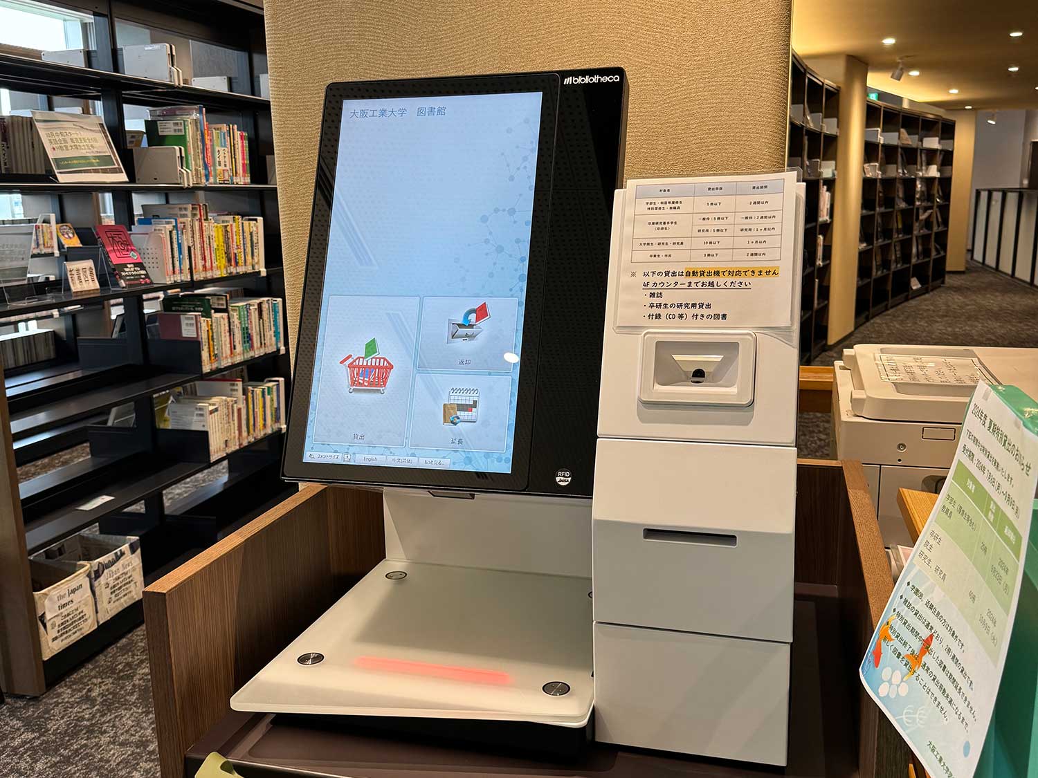 図書の貸出しや返却手続きが便利にできるように、4階から6階までの各フロアにBibliotheca社製のUHF対応の自動貸出返却機を設置しています。複数の図書を瞬時に読み取り、画面に出てきたリストを確認してタップするだけで簡単に貸出しも返却もできるため、現在では貸出の大半は自動貸出機が利用され、カウンター業務の軽減に役立っています。貸出だけならスマホアプリを利用した手続き方法も導入しました。退館の際はBibliotheca社製のBDS装置が未手続の図書があれば感知して、カウンタースタッフに知らせるとともに本を特定することもできます。
